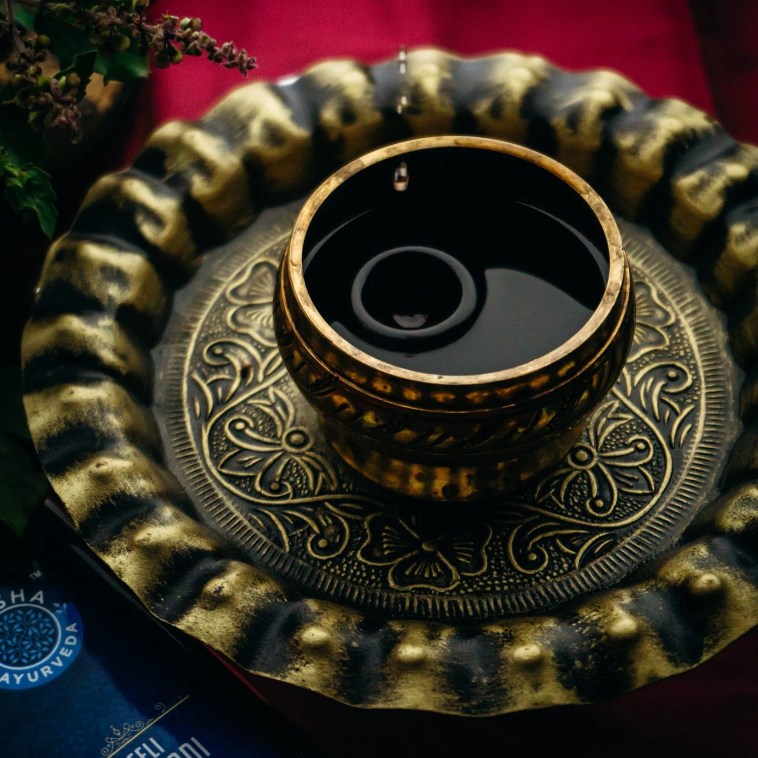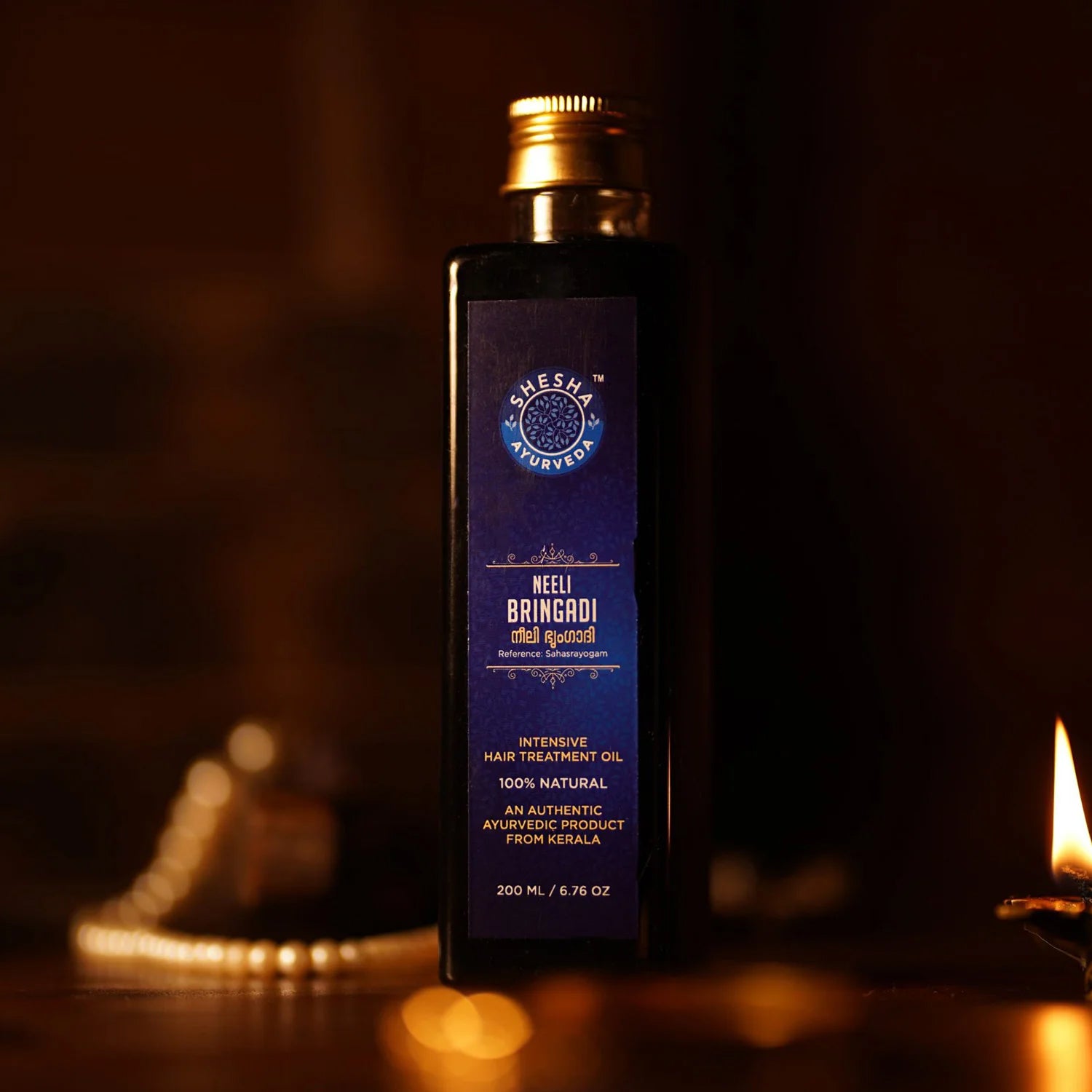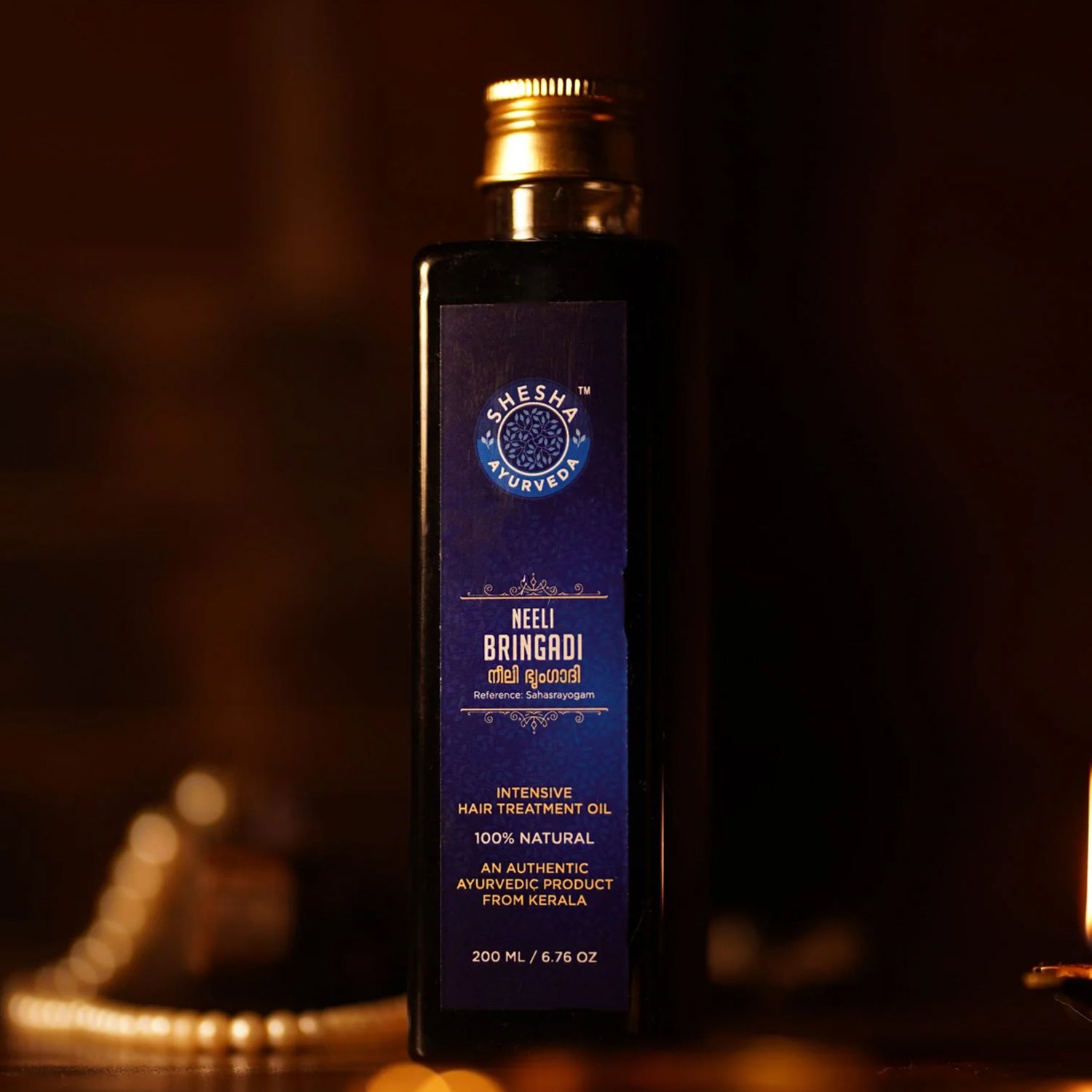 Based on Authentic Ayurvedic reference Sahasrayogam, Shesha Ayurveda Neelibringadi hair treatment oil is made of Indigo (Nilini), Bhringraj, Balloon Vine (Indravalli), Virgin Coconut Oil (premium quality Grade 1), Liquorice (Yashtimadhu), Indian gooseberry (amla), Rosary Pea Root (Kakadantika), Indian Barberry (Daruharidra), Coconut milk, Milk – Cows Milk, Goat’s Milk, Bufallo’s Milk and Camphor
