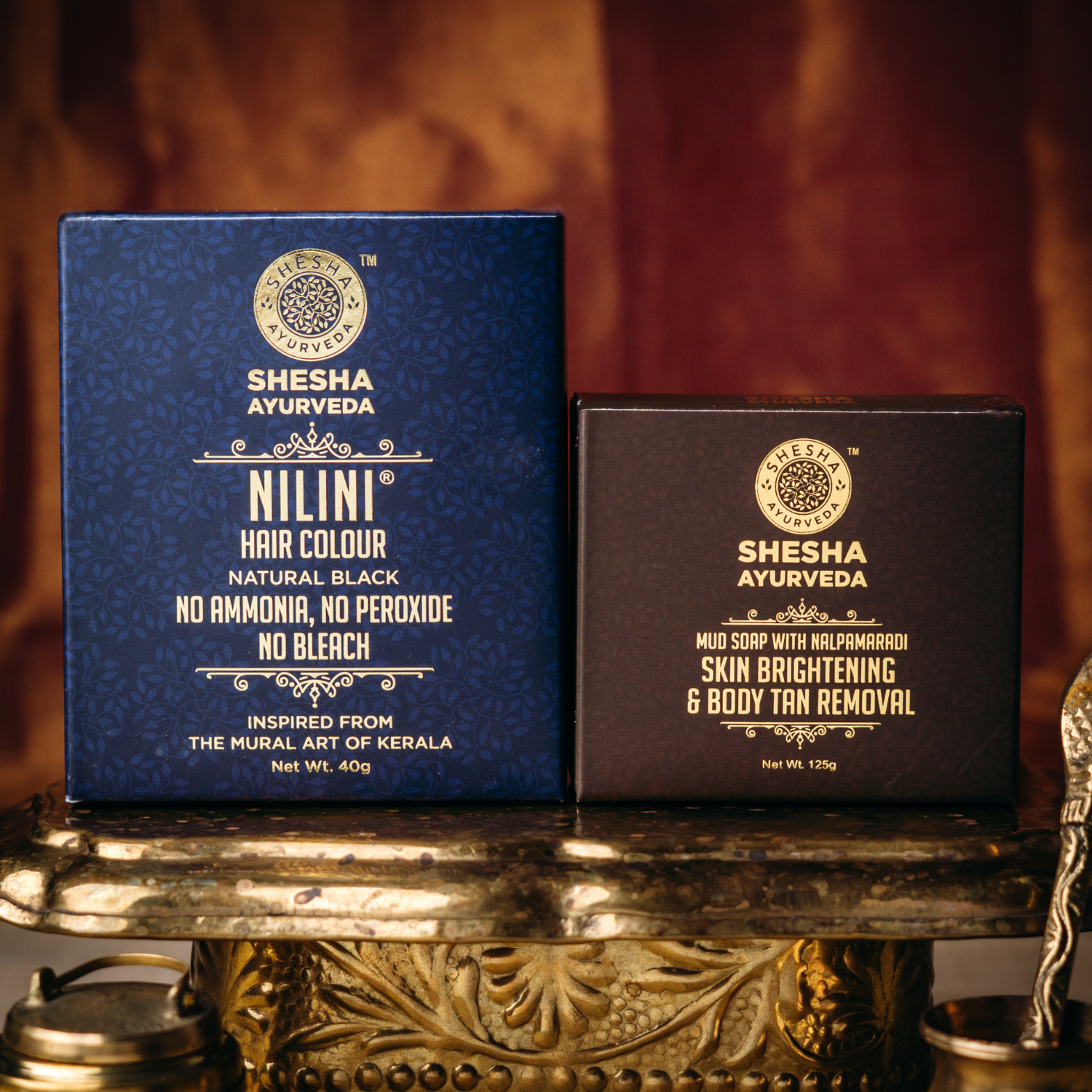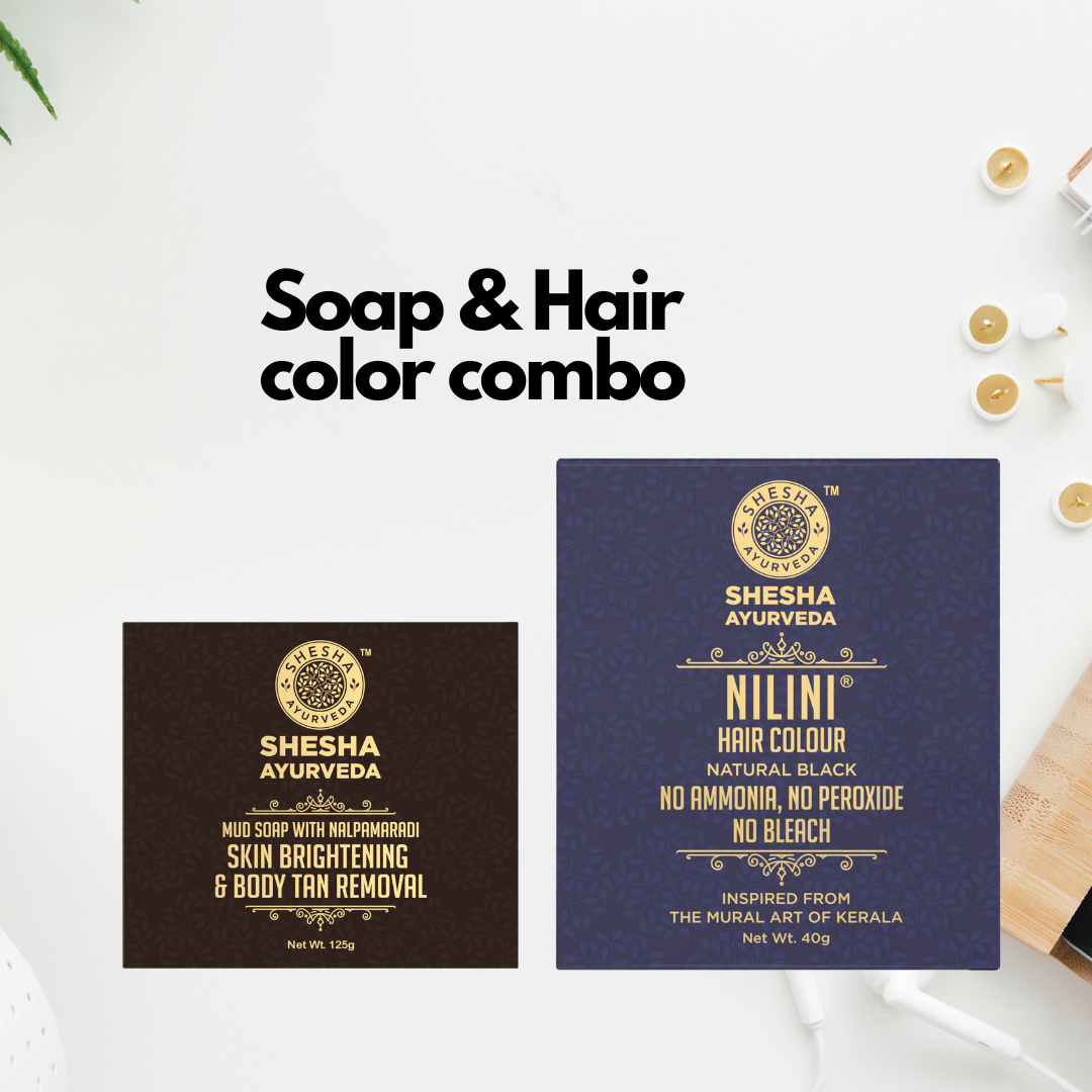 The combo includes a Nilini Hair Color in Natural Black 40g and a Mud Soap enriched with Nalpamaradi 125g